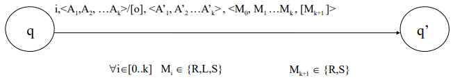 for this 1-tape machine takes the current state , the input symbol , and the memory symbol and produces a new state , a new memory symbol , and movement instructions and for the input and memory heads, respectively.