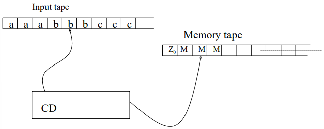 , where the machine must process an equal number of as,bs, andcs in that order. The machine operates as follows: