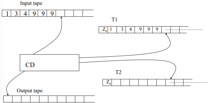 , encoded in decimal digits. The machine uses two memory tapes ( and ) to perform the computation: