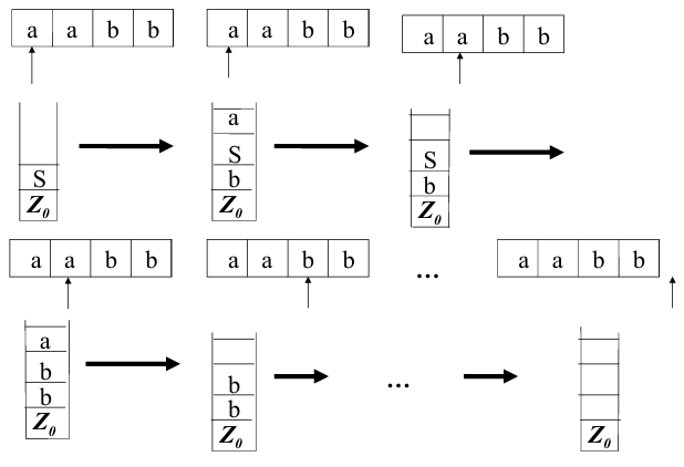 Consider the grammar , which generates strings with equal numbers of ’s followed by ’s. This grammar can be represented by a pushdown automaton that pushes an onto the stack for every occurrence of in the string and pops it when encountering a .
