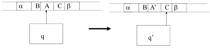 For example, if , the grammar includes a rule like , indicating that the TM moves to state , writes symbol , and moves the tape head to the right.