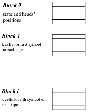 Block of Cells for Each Tape: For each -tuple of tape cells, we associate a block of RAM cells. This allows the RAM machine to mimic the structure of the multiple tapes used by the Turing machine.